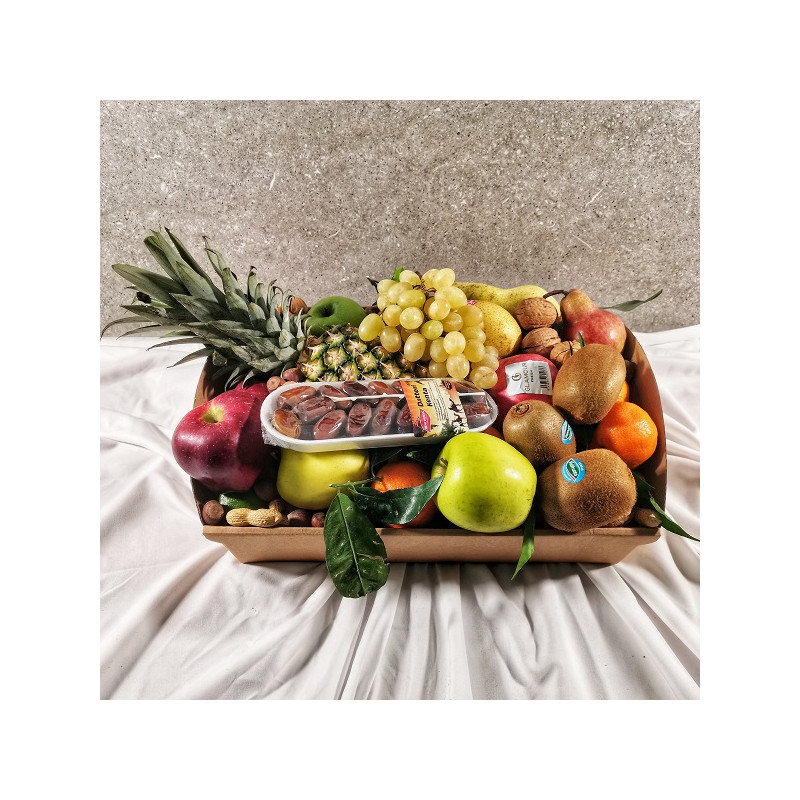 Composizione di frutta fresca di stagione selezionata e frutta esotica natalizia con l'aggiunta di datteri e frutta secca. ** l'immagine è a scopo puramente illustrativo Provenienza in base alla disponibilità: Italia, Spagna, Costa Rica, Messico, Colombia, Mozambico, Brasile, Perù, USA.